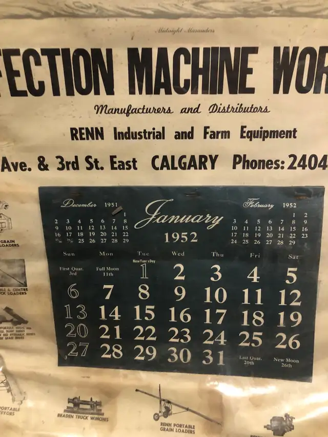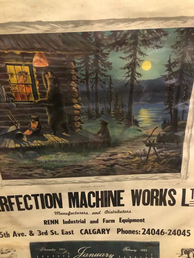 Most likely a one if a kind loxal Calgary advertising calendar from 1952– not perfect but pretty dang close— wrapped in plastic— from Perfection Machine Works/ besutiful calendar 35 x 21