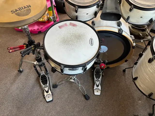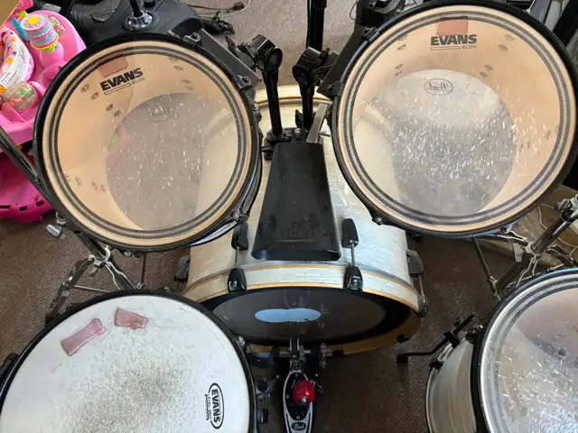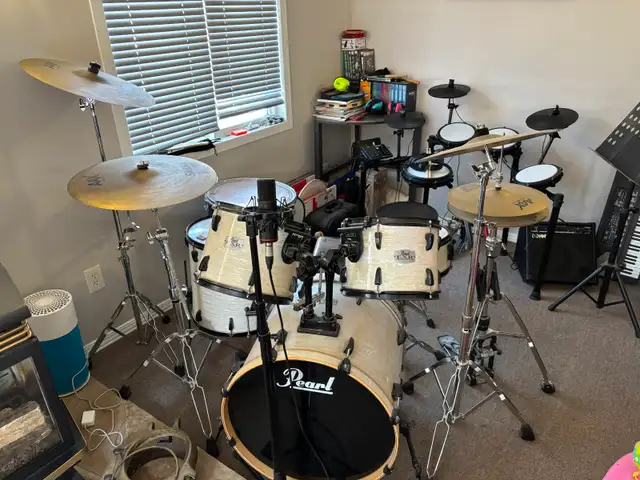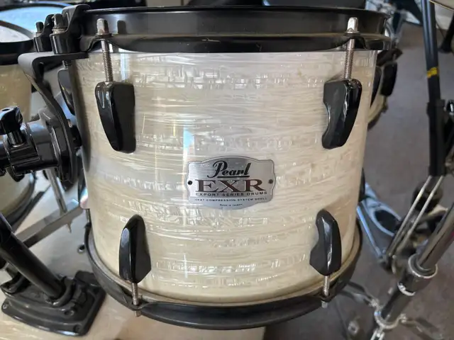 Pearl EXR Drum Set, all batter heads recently replaced, 22" bass, 14" snare with new custom pro wires, 12/13/16 EXR toms, 18" floor tom is not Pearl. Sabian AAX cymbals, 14" stage hats, 16/18" Ex-Plosion crashes, 20" stage ride and 16" Sabian China. Pedals are 2000 series for both bass and hi-hats. Complete with all hardware. Set is assembled and ready for a drum solo. $2200 Please text to 705-430-0042 or send email