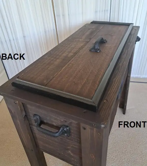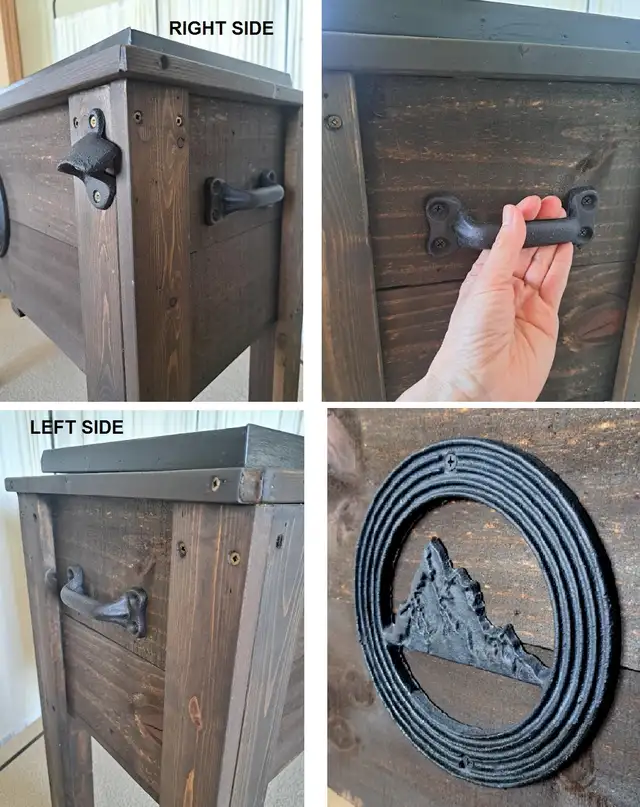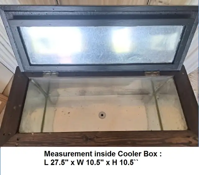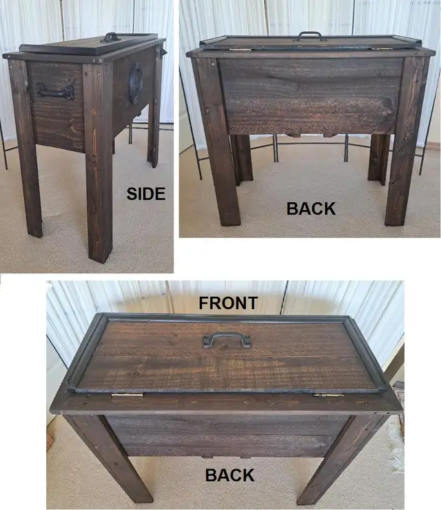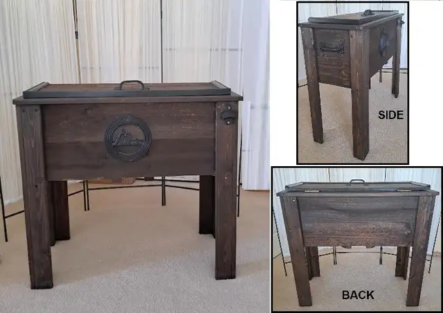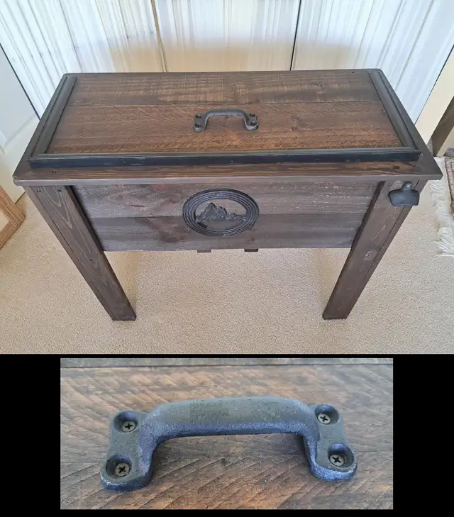 NEW! This wood cooler box / ice box / wine chiller is uniquely Handmade for indoor or outdoor entertainment furniture. Newly stained in kona dark brown with grains and knots showing through. Feature stainless steel cooler box with drainage valve, handy bottle opener, large cast iron handles on sides for ease of handling, one handle on top of lid. All powder coated hardware for durability and to prevent rust or stains. Measures H 30” x W 33” x D 15”. See pics for more details. Like New, from non-smoking home, Tuscany NW, 403-828-5672. # Delivery can be arranged,charges will be collected prior to delivery #. Make the most of your trip, we have more spring / summer items for Sale, check our Other Listings here.