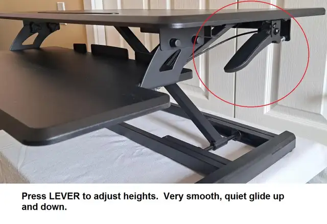 Quality, Like New SEVILLE Classics AIRLIFT Standing Desk Converter / Laptop Stand / Laptop Desk / Tablet Table / Smartphone all-in-one workstation for zoom etc. Features high-quality steel x-frame, designed to support single monitor, dual monitor, and laptop monitor setups with ease, includes groove for tablet, smartphones or notepads for viewing and use while you work. Keyboard tray is detachable, designed with an ergonomic cut-out for maximum user comfort. AIRLIFT gas spring technology provides smooth, step-less, pneumatic height-adjustment; set it at any height from the minimum of 4.7 inches to the maximum of 17 inches high, great for sitting or standing positions. MEASUREMENT : Top tier 30.3" x 20" x 0.59" thick, keyboard tray 29.9" x 6.9" x 0.59" thick. Next to new, in great working, clean condition. Non-smoking home, Tuscany NW, 403-828-5672. We have more items for sale, check our Other Listings here. # This unit retails at $357.82 new at Walmart, link : https://www.walmart.ca/en/ip/Seville-Classics-Airlift-Height-Adjustable-Sit-Desk-Converter-Workstation-Standing-Ergonomic-Dual-Monitor-Riser-Keyboard-Tray-Compact-30-Black/2LPHADYTJYMT