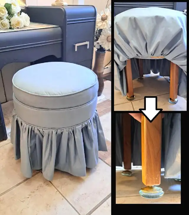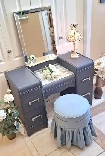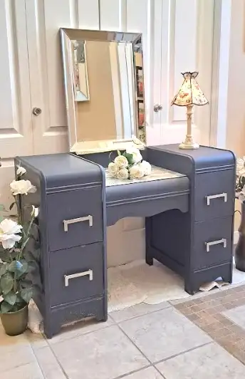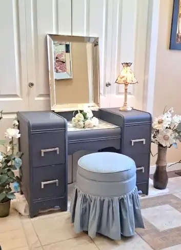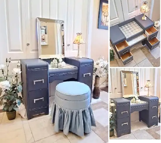 Gorgeous Dovetail 5-Drawer Maple Waterfall Dark Blue Dressing Table / Make Up Station. Comes with newly cleaned upholstered blue fabric round STOOL and New MIRROR. Classy sleek decorative details with waterfall fronts, curve and swirls on bottom of drawers, see pics. Strong, thick and deeper sized dovetail jointed drawers that glides and operates smoothly. Sleek brush nickel pulls. Vanity Dresser measures : L 39 1/2" x D 16" x H 27" 1/2"). All items in great clean condition, from non-smoking, clean home, Tuscany NW, 403-828-5672. * DELIVERY is available, payment of item delivery charge must be received prior to loading & delivery. Check delivery charges by providing location. * We have more furniture and other items available for Sale, check our Other Listings here.