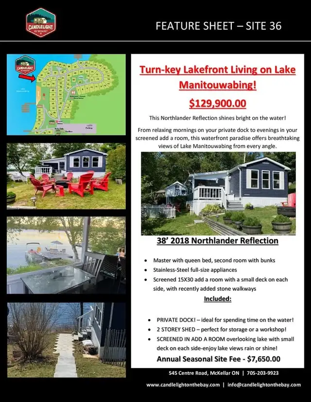 Wake up to lake views at this stunning 2018 Northlander Reflection (38 ft), perfectly situated on a waterfront site on Lake Manitouwabing—complete with your own privately owned dock!