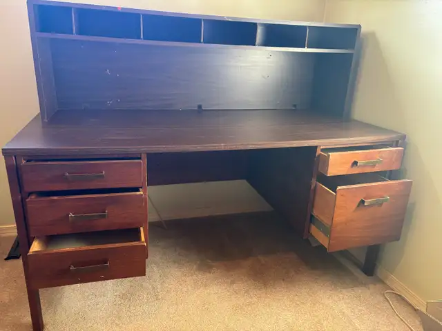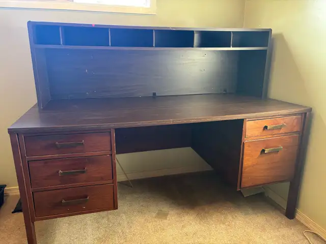 This older solid wood desk comes with a detachable upper shelf, perfect for a home office or study space. While it's in used condition, it's sturdy and functional. The desk features multiple drawers for ample storage. This desk could be yours! Act now, the desk is waiting for you. If the ad's still up, it's still available! Call 403-580-7006