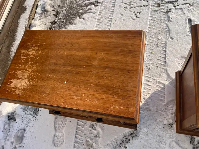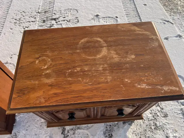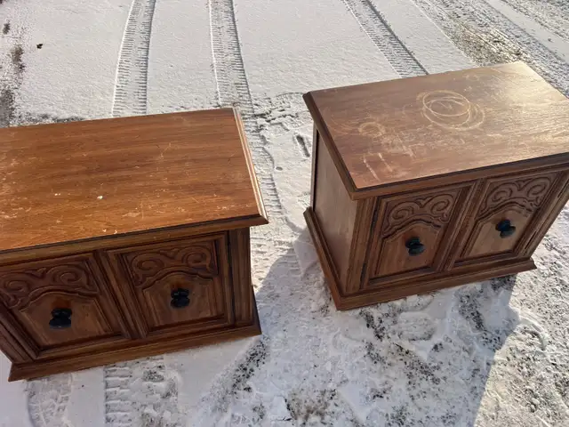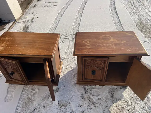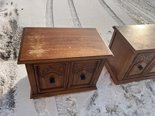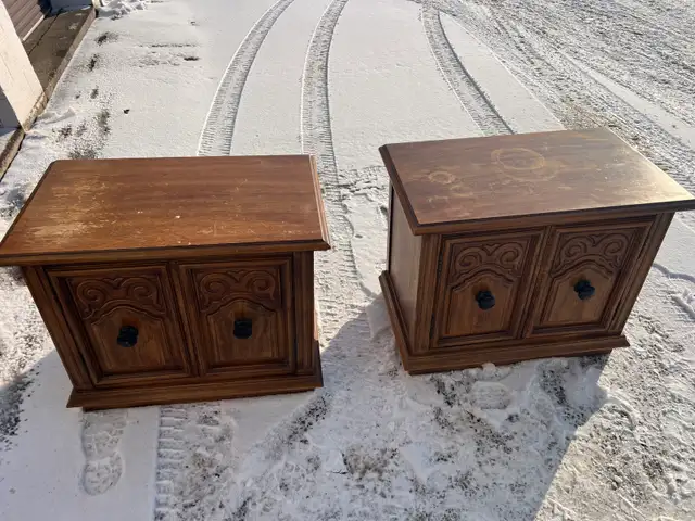 Selling a used pair of vintage wooden side tables with decorative carved doors and black knobs. Wood material, nice for a living room or bedroom.