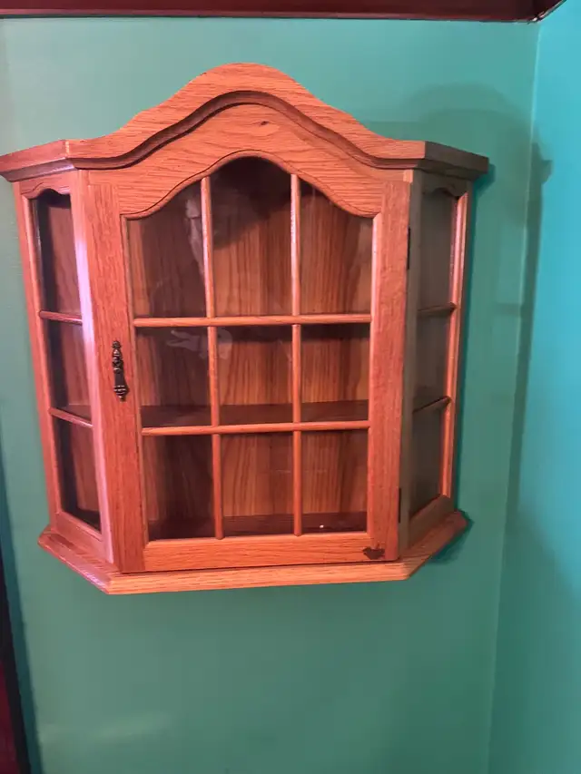 Lovely oak corner display cabinet. It features glass doors and multiple shelves inside for showcasing collectibles. This piece would be great for a den or entryway!