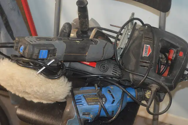 For sale here are five corded power tools. Although these tools are used and not in new cosmetic condition, they are in perfect working order. They are a jammer drill, a jig saw, an angle grinder, an oscillating saw and a power buffer They come with some accessories. I am asking for a very reasonable 60.00 for all. I will not sell them separately. The replacement value if bought new today is well over $500.00! Please call, text with your questions (905) 731-5914 or email.