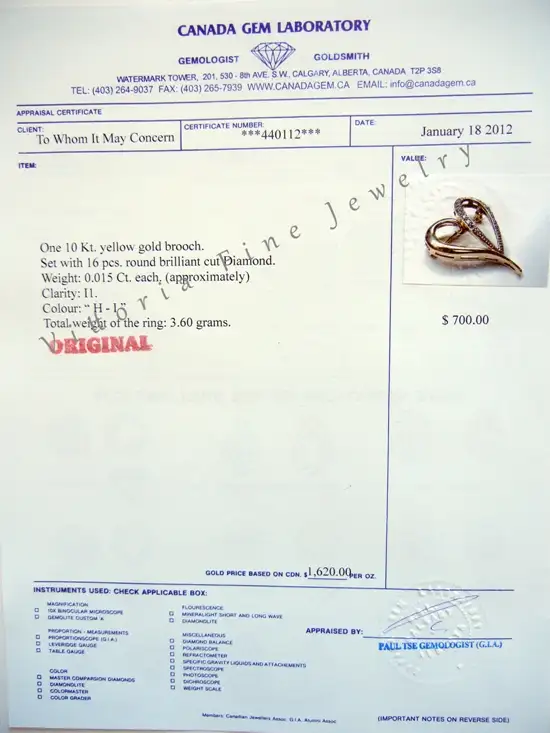 2. The original copy of GIA Jewelry Appraisal Certificate