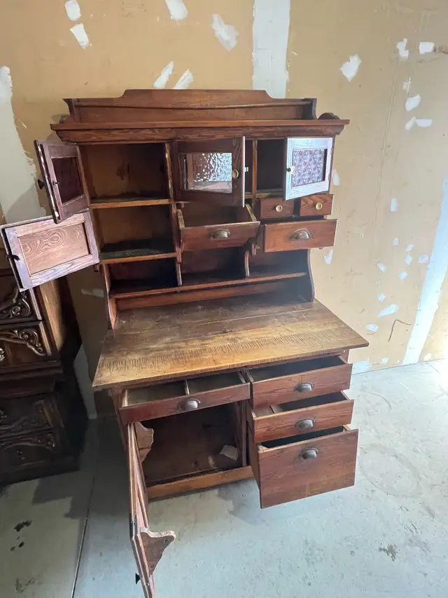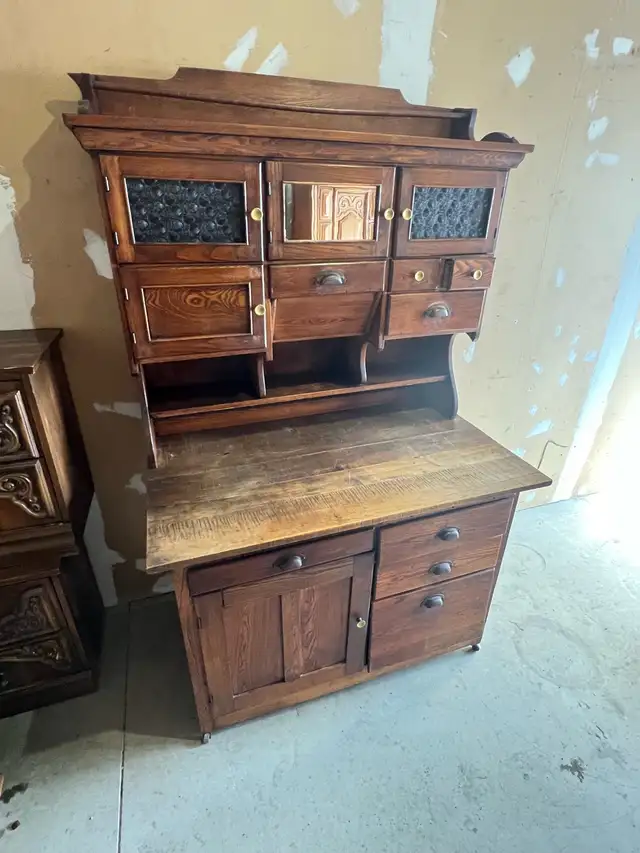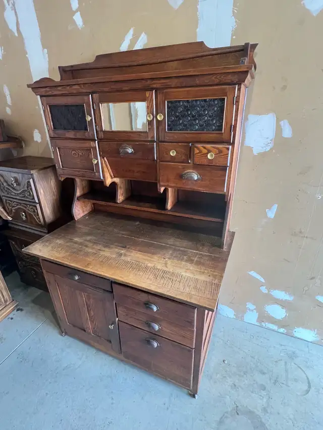 This antique oak kitchen hutch features a mirrored upper cabinet section and decorative glass doors. It includes multiple drawers and a lower cabinet for storage. The wooden surface shows some signs of wear. It's a solid piece perfect for displaying dishes or storing kitchen essentials.