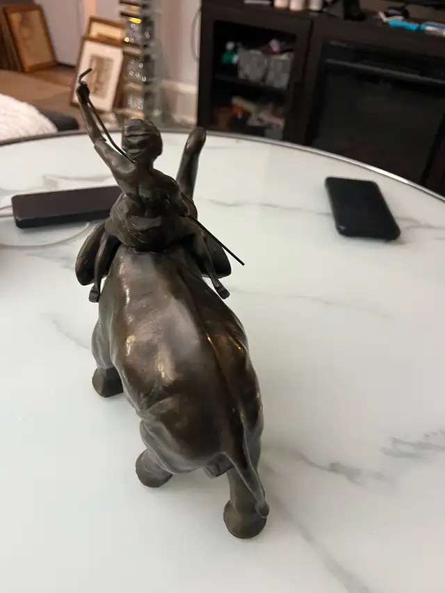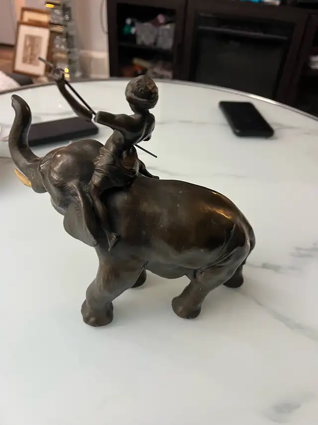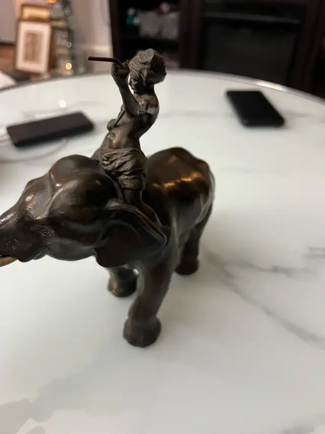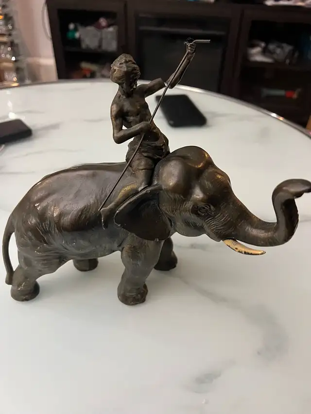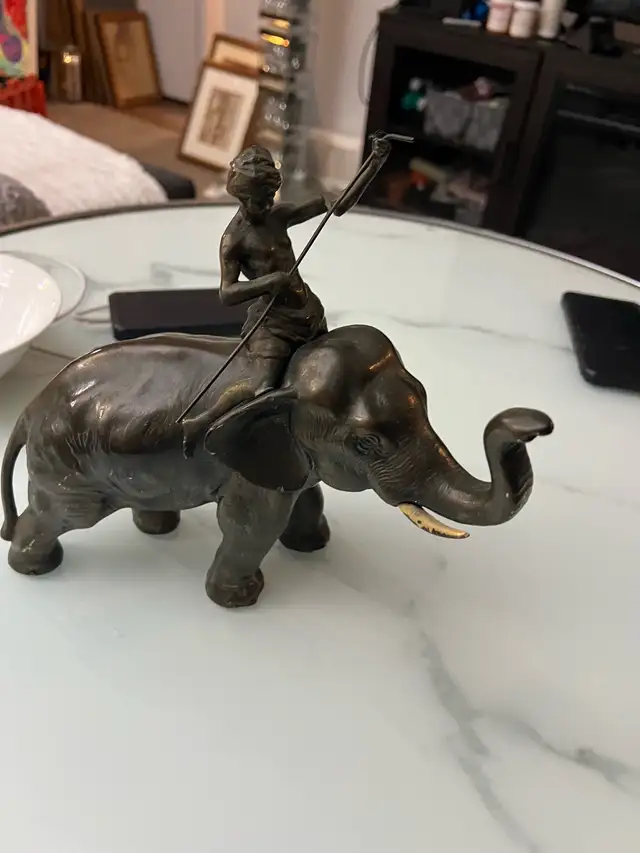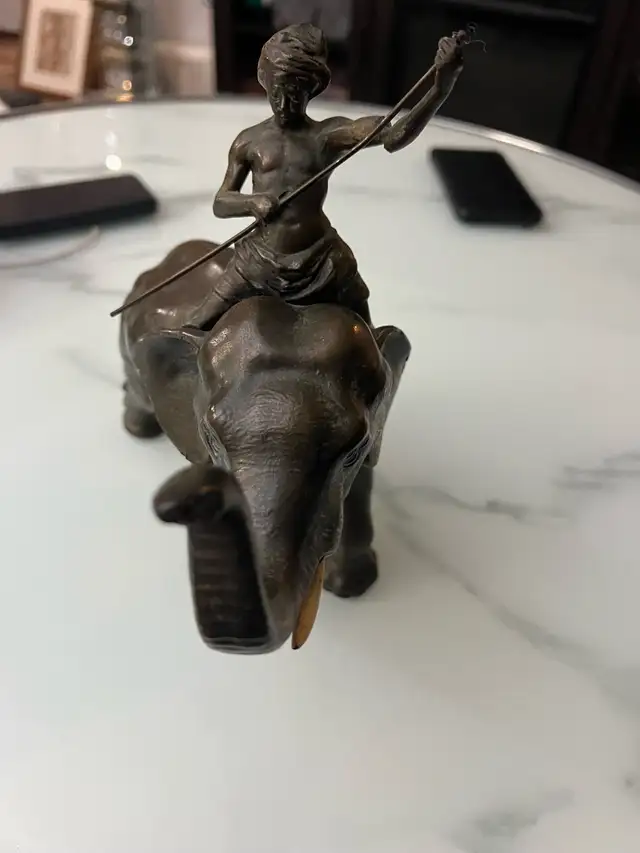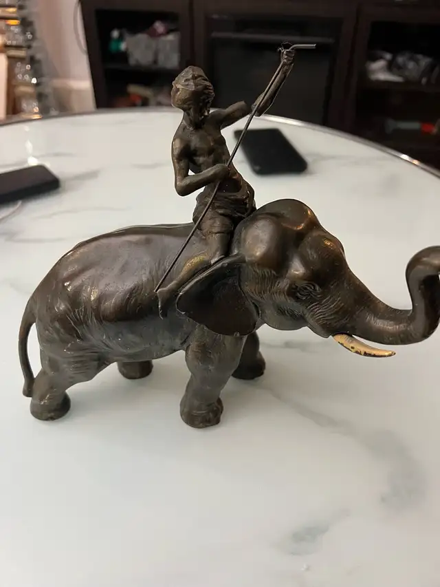 This is a bronze statue depicting a rider on an elephant. It's a detailed and artistic piece. Bronze material.