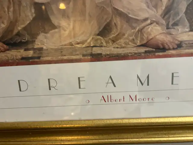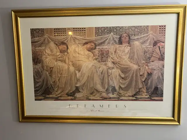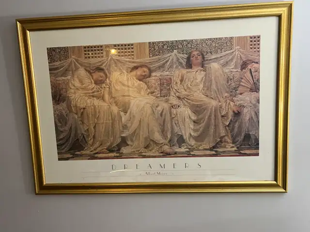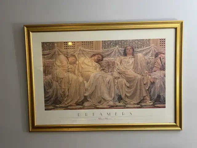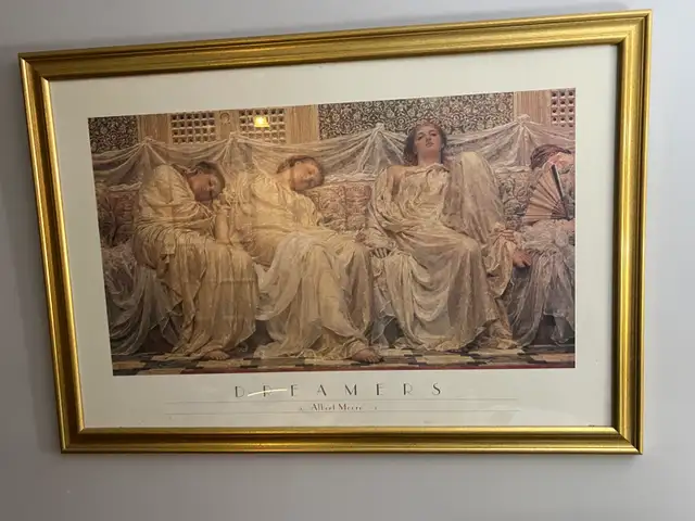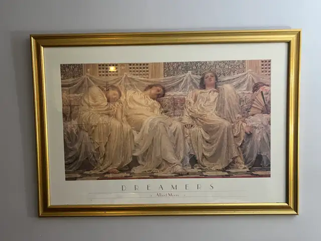 This is a framed print of Albert Moore's artwork titled 'Dreamers'. It features classical figures reclining on a sofa. The gold frame adds a touch of elegance to this piece.
