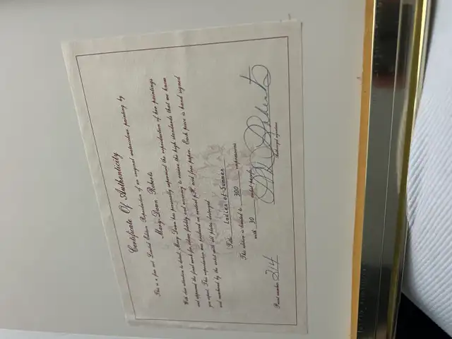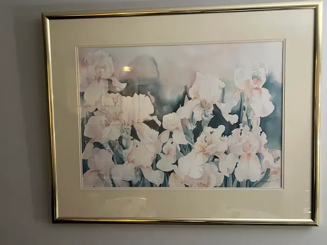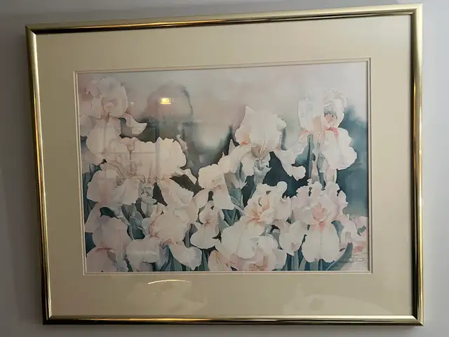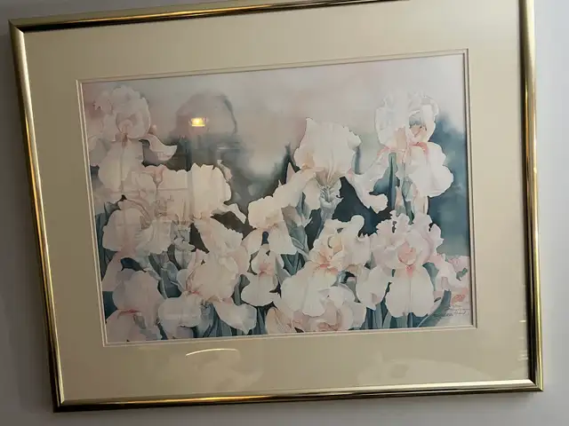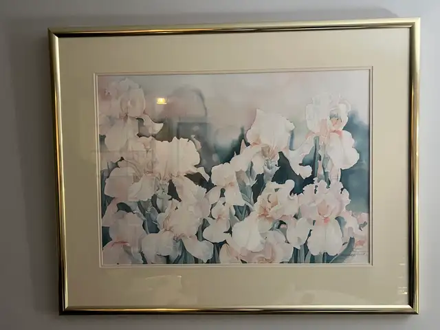 Marilyn L. Sturm print titled "Iris Dream". It's a limited edition, number 214 out of 300. The artwork is framed with a gold-tone metal frame and a cream mat. This piece would brighten up any room!