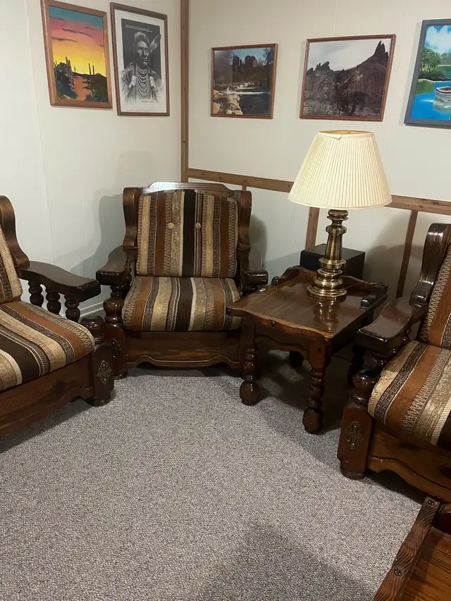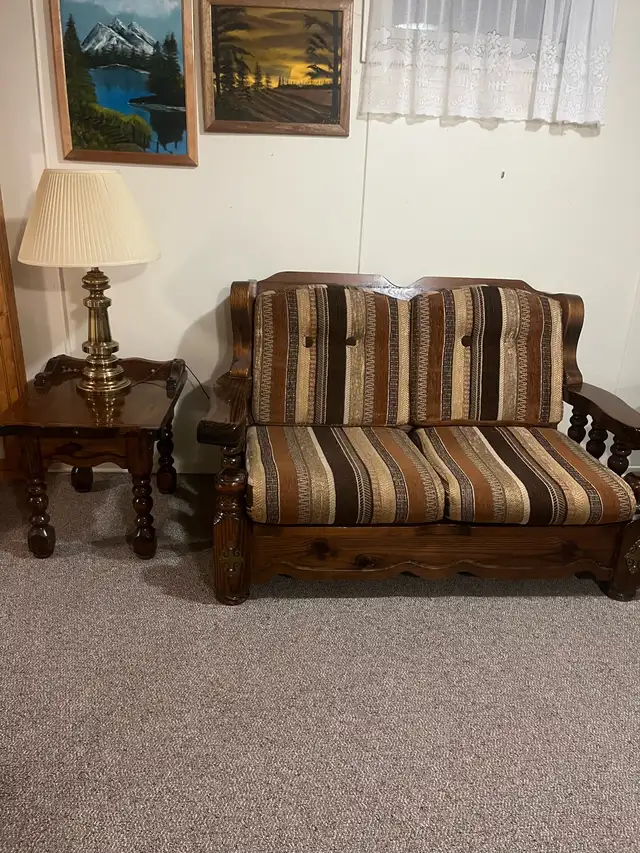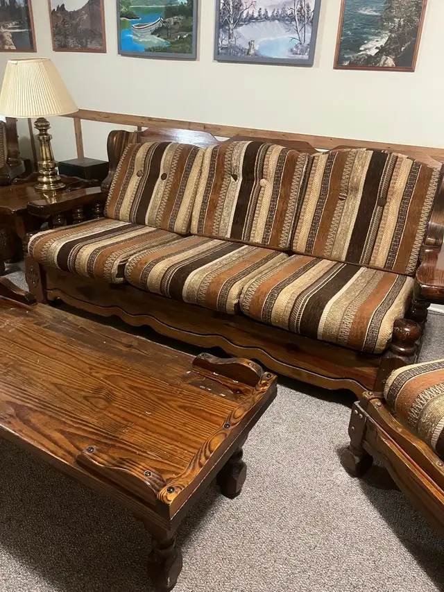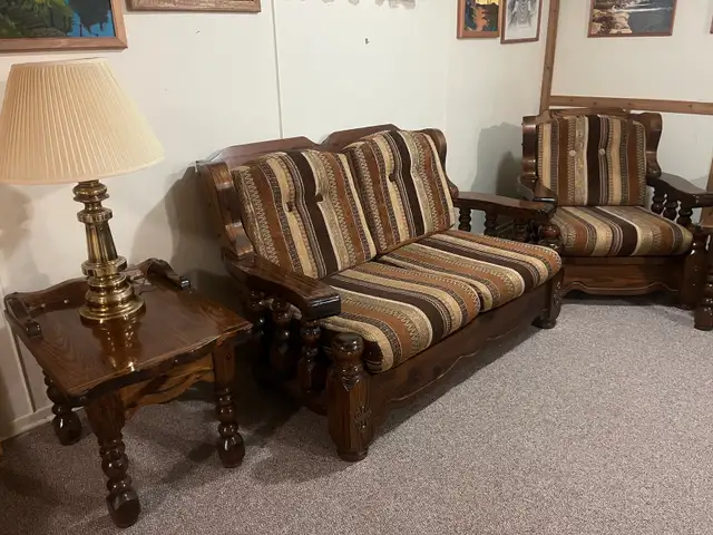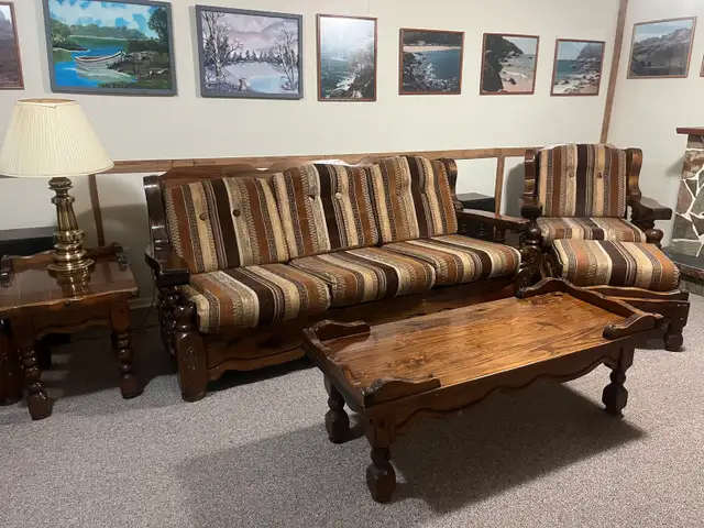 This is a large, solid wood set with couch, love seat, two arm chairs, an ottoman, two end tables and a coffee table. It really needs to be seen to be appreciated.
