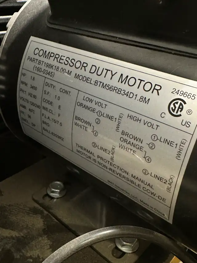 5.5 CFM @ 90PSI 6.3 CFRM @ 40PSI 1.6 RHP 120/240