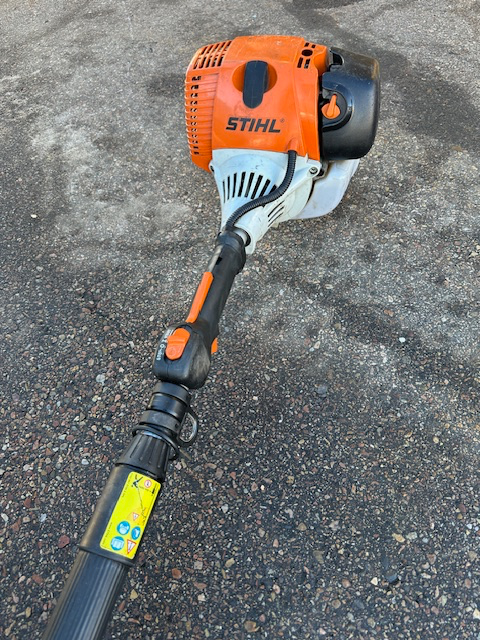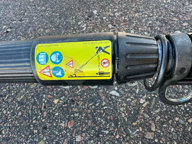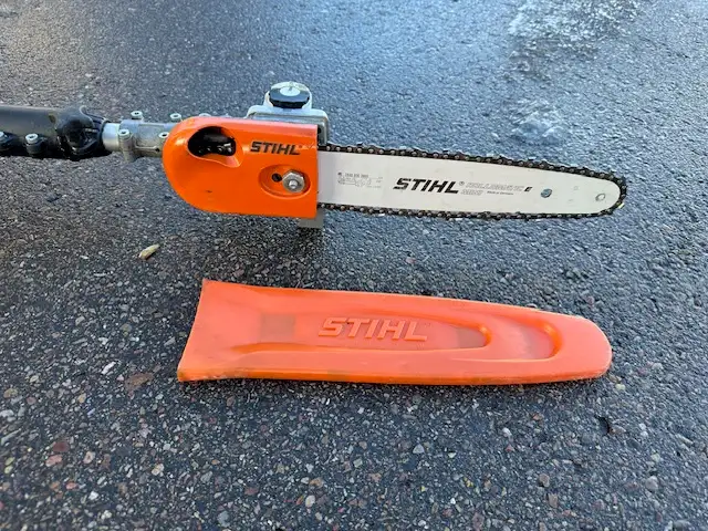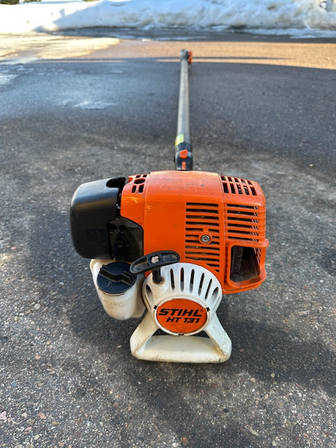 Stihl HT Series Telescoping Pole Saw Chain Guard Full Body Harness Features Benefits 14in. bar with 1/4in. STIHL PICCO™ Micro™ 3 (PM3) saw chain delivers quick, clean cuts Simplified starting with semi-automatic choke lever and one-touch stop Reduced emission engine technology produces zero or low exhaust emissions that are cleaner than EPA and/or CARB exhaust emission standards Anti-vibration system minimizes vibration levels to reduce operator fatigue and provide a more comfortable working experience Multi-function control handle provides easy access to all of the controls without the operator's hands ever leaving the comfortable handle Telescoping pole stays rigid while extending from 7 1/2ft. to 11 1/2ft. length and easily locking into the desired position Reduced weight pole and cutting head reduces operator fatigue and is designed for easy handling Large fuel tank provides up to 30% longer run times when compared to previous models Non-slip grip clamp Purge pump primer delivers fuel directly to the carburetor to help promote quicker starts STIHL HT 131 14" Gas Powered Pole Chainsaw.