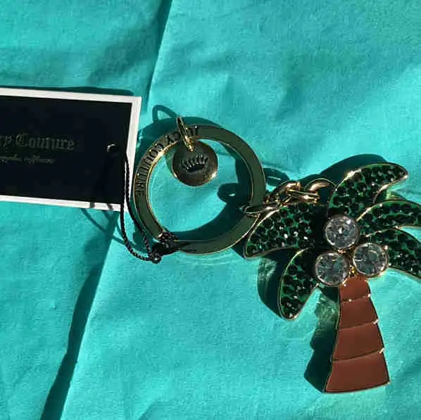JUICY COUTURE Keychain Bag Charm - palm tree set with 3 brilliant sparkle stones on a heavy gold key chain. Never used and still in original box. Palm tree has green branches that show off the 3 stones. Sells for $30 online. Will sell for $15. OBO.