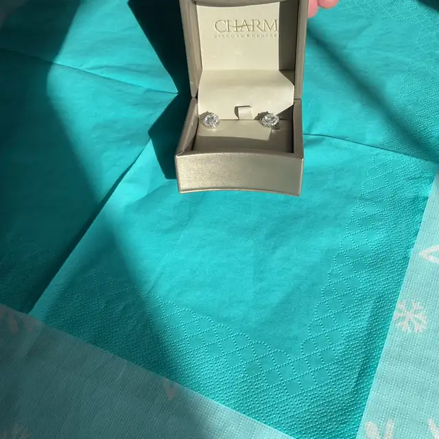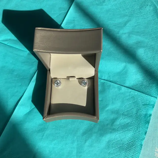 NEW - Earrings, STUD, large centre stone surrounded by 12 small stones, cubic zirconia set in silver. Never worn. Purchased from Charm Diamond Centre. List price in store $125. Will sell for $65 OBO. Brilliant sparkles. Earrings are in original packaging.