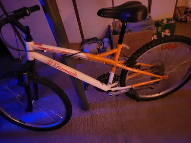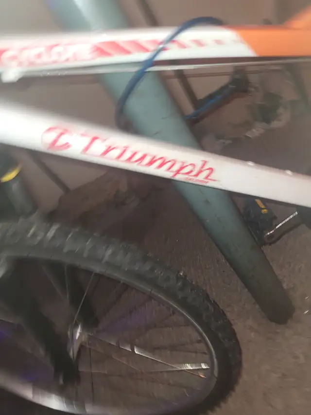 I have a triumph cyclone mountain bike 21 speed 24-in wheels The bike has no rust it's like new everything works as it should except for the back brake cable it needs adjusting it's been a great bike. Call or text Courtney at 587-851-0633 prices firm and pick up only please.