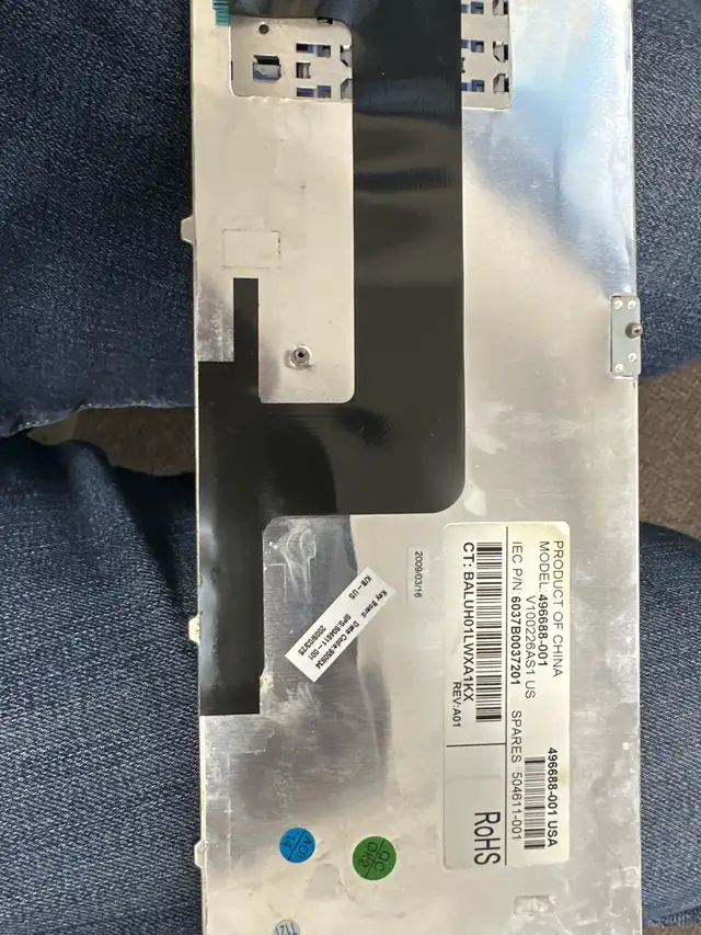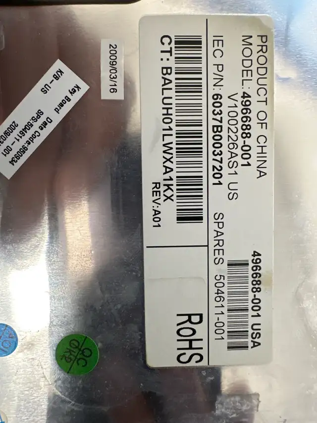 This is a black HP laptop keyboard, model number 496688-001, that is in used condition. It is a standard keyboard layout, and would be excellent as a replacement part. It has been pulled from a working unit, and is guaranteed to work.
