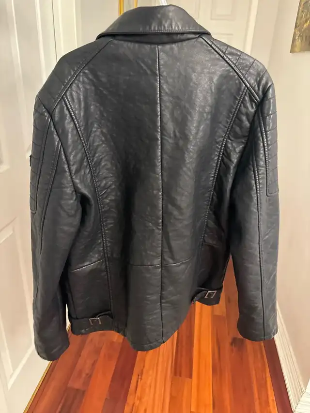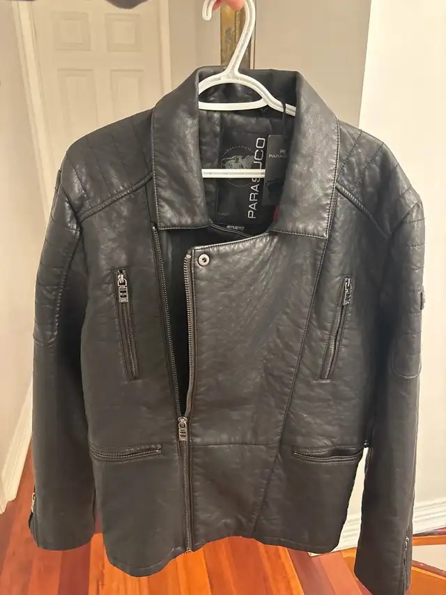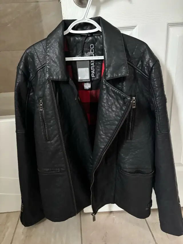 This is a Parasuco black leather jacket in size large, featuring a stylish moto design with an eye-catching red plaid lining. The jacket is BRAND NEW!!!!