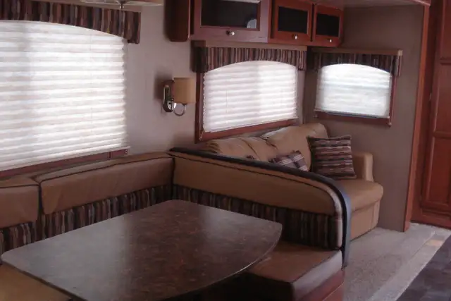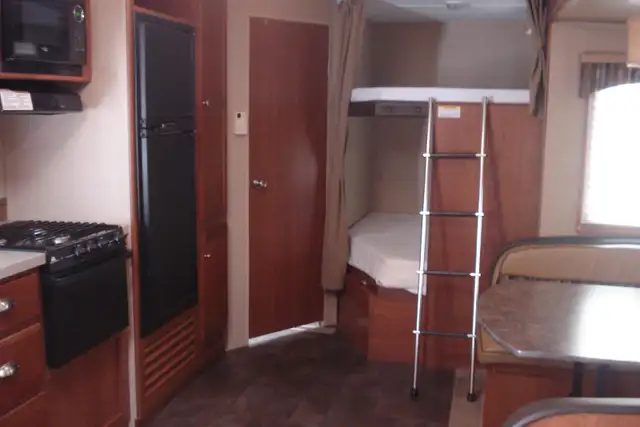 Trailer has a Queen bedroom, Rear bunks, Large slide-out with sofa and dinette.
