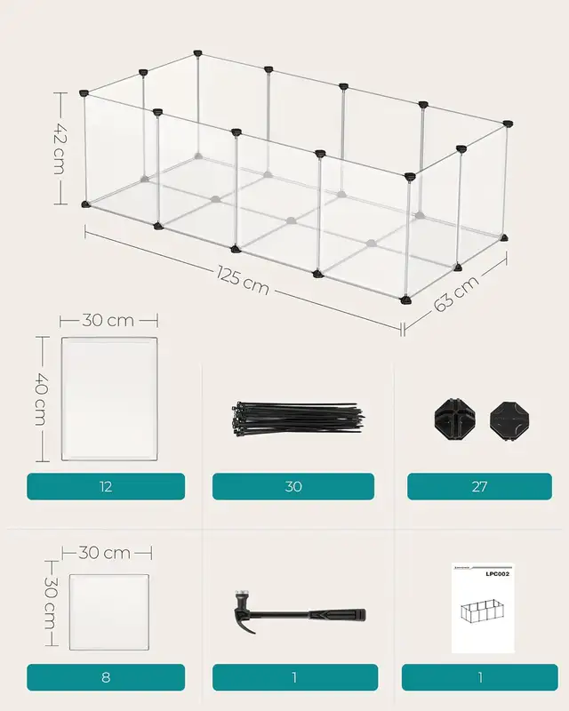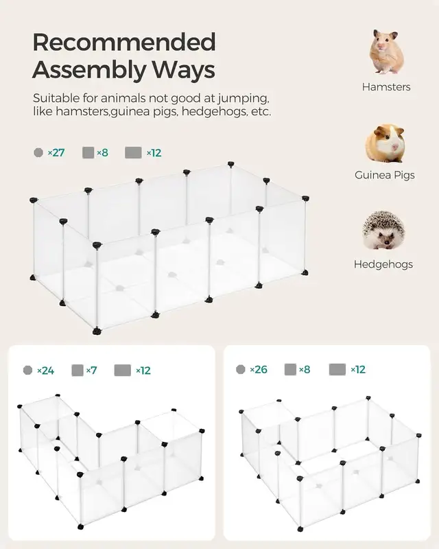 Give your small pets a safe and roomy place to play with this SONGMICS modular playpen. Designed for guinea pigs, hamsters, hedgehogs, and bunnies, this lightweight enclosure is easy to assemble, rearrange, and clean. The semi-transparent panels let you keep an eye on your pets while they explore, stretch, and relax.