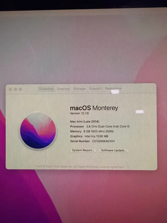 The Mac mini has a 2.8GHz Dual Core Intel i5 with 8GB of Ram.