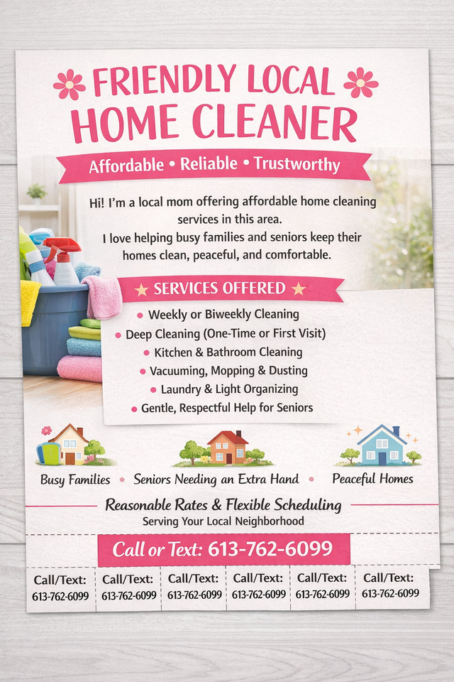 Hi! I'm a reliable local mom offering affordable home cleaning services in the area.