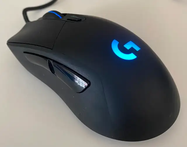 G403 Prodigy Mouse: A right-handed ergonomic wired mouse with rubber side grips and a removable 10g weight for customizing feel. It uses the PMW3366 optical sensor with a DPI range of 200–12,000 and a 1ms report rate. Six programmable buttons, onboard memory for saving profiles, and 16.8 million colour RGB lighting round it out.