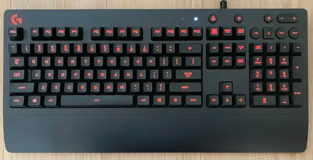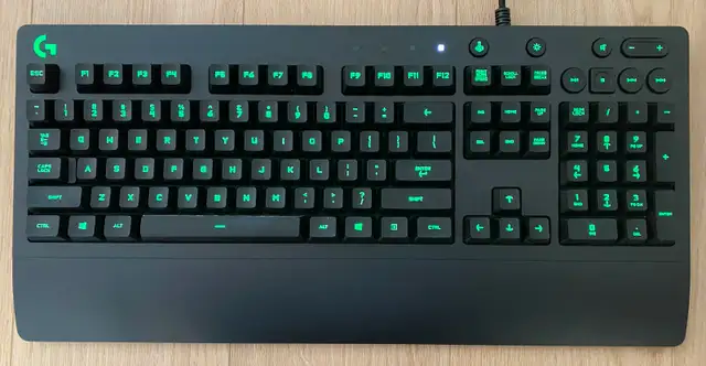 G213 Prodigy Keyboard: A full-sized wired keyboard using Logitech's proprietary "Mech-Dome" switches — membrane switches tuned to mimic a mechanical feel with a 4mm travel distance and 50g actuation force. It features 5-zone RGB lighting with 16.8 million colour options, dedicated media controls, an integrated palm rest, adjustable feet, and spill resistance rated to 60ml. Anti-ghosting is included for multi-key gaming inputs.