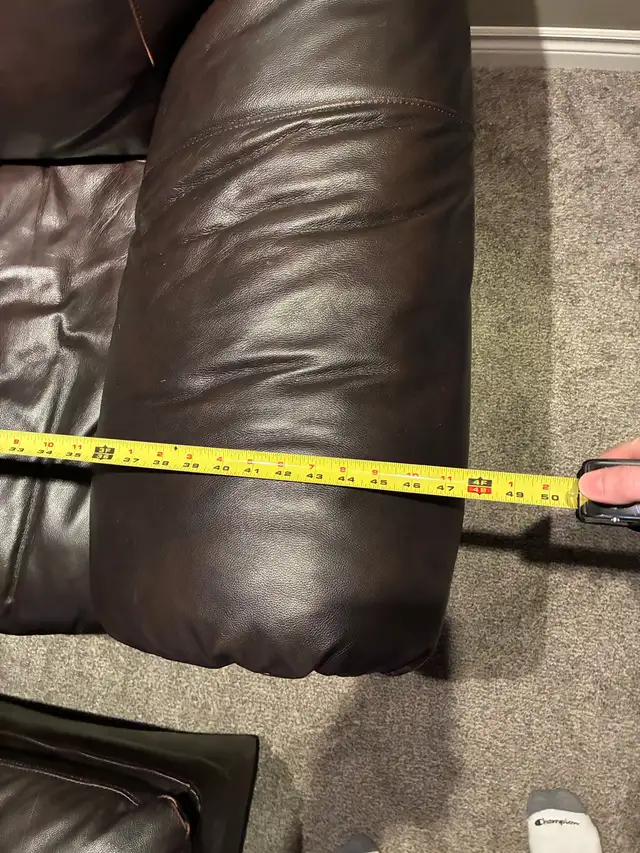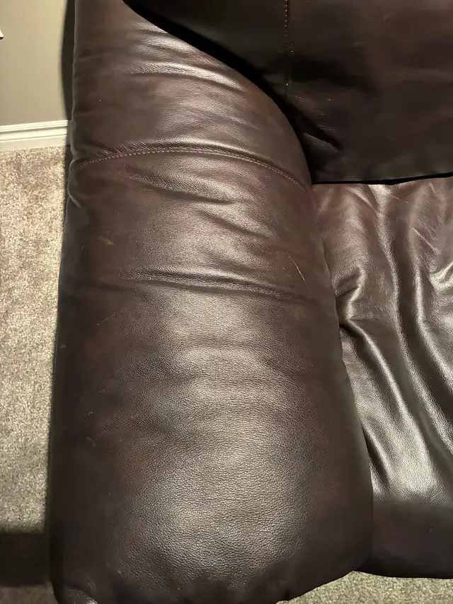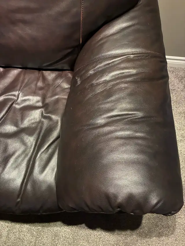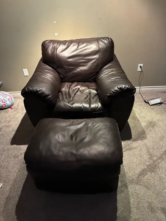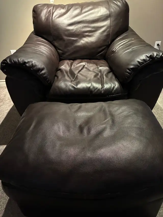 Used dark brown leather chair and ottoman set. Very good condition with minor wear.
