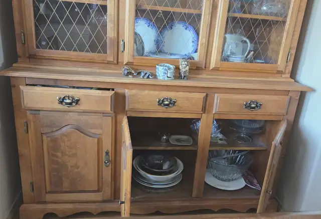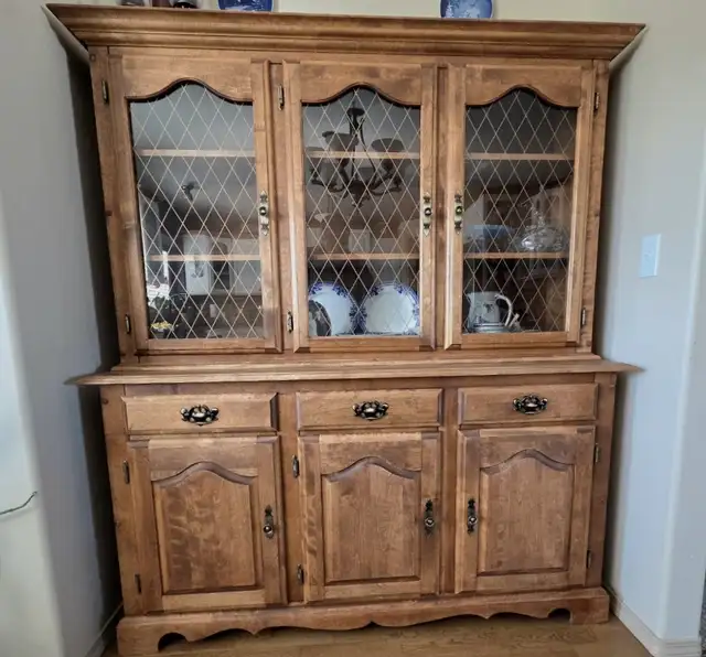 This beautiful set has been hand-finished with Watco Danish Oil that penetrates deeply into the wood. It is solid birch, well-built here in Canada. The hutch glass doors open to rich wood shelves perfect for displaying your most treasured items. The buffet has three doors that open to solid wood shelves, plus three pullout drawers above them.
