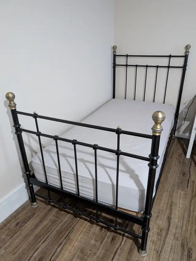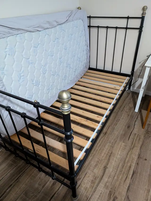 Selling my used twin metal bed frame complete with wooden slats and mattress. Item is in good condition.
