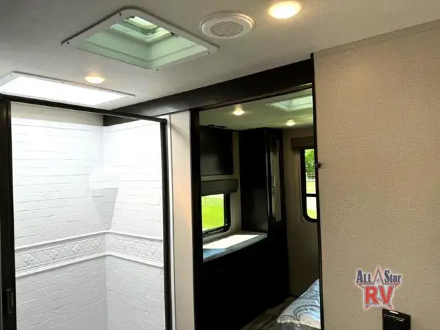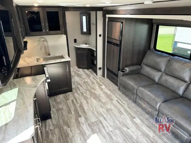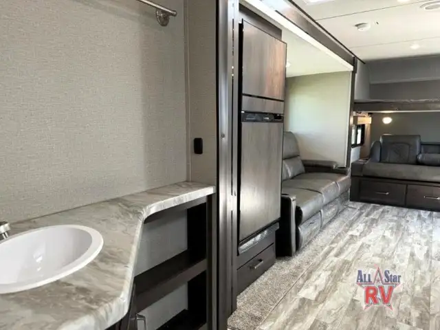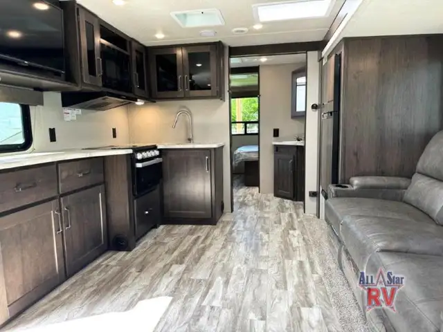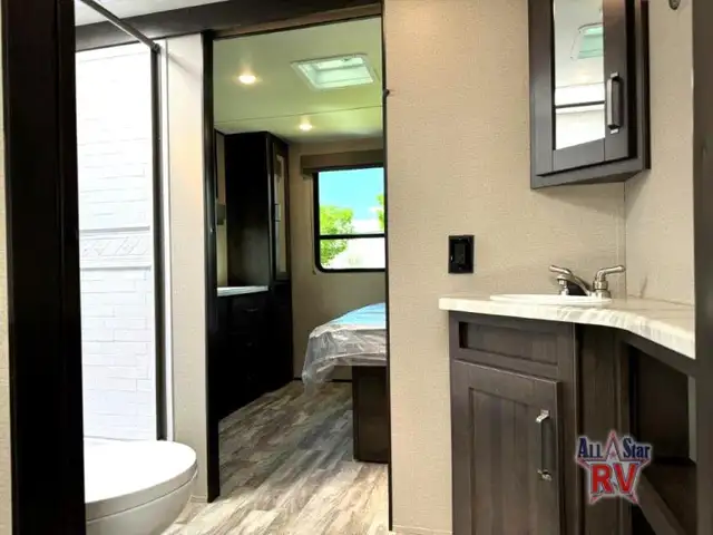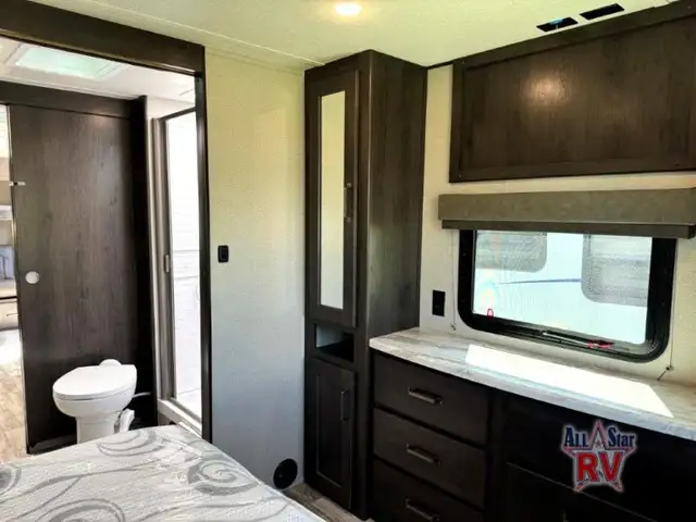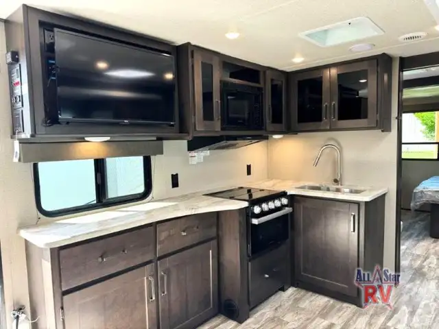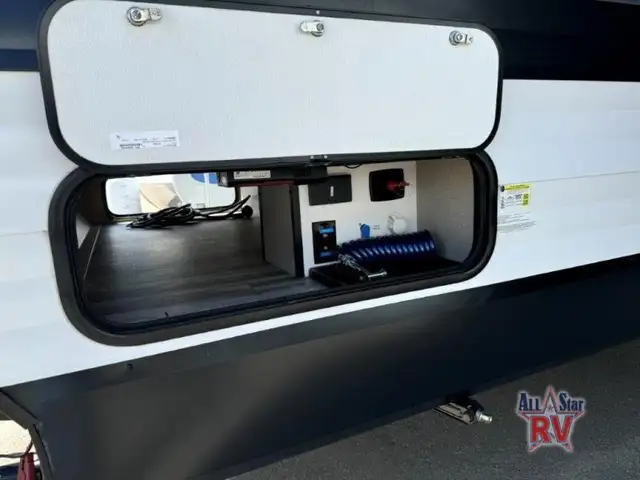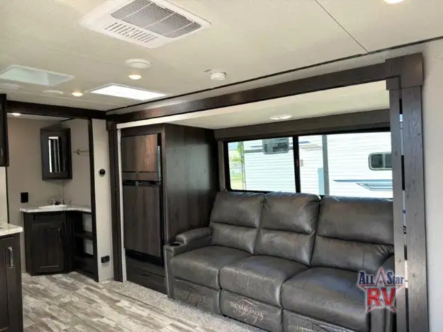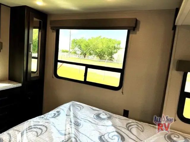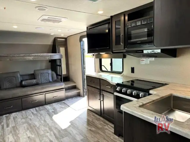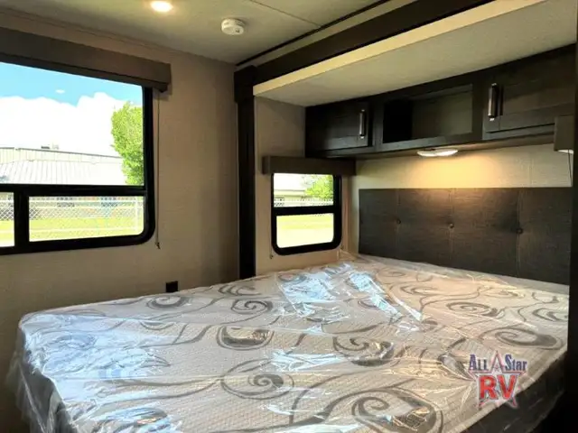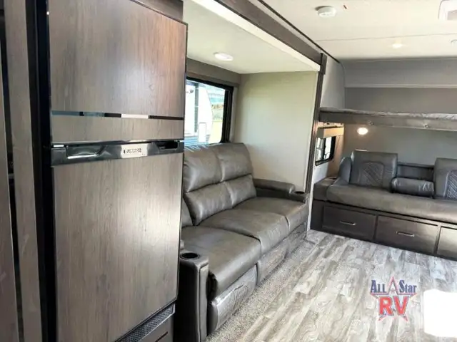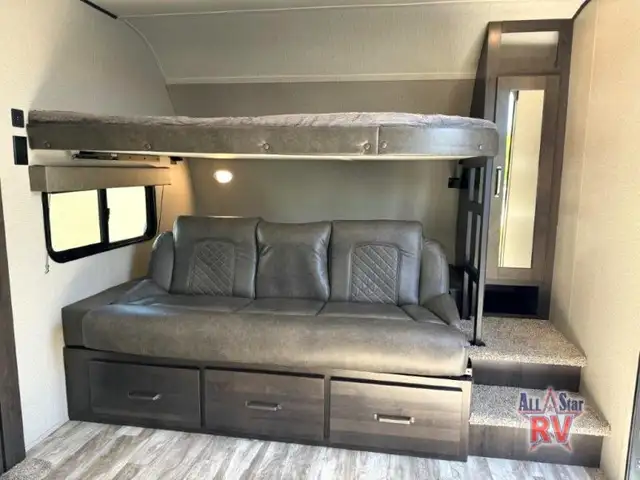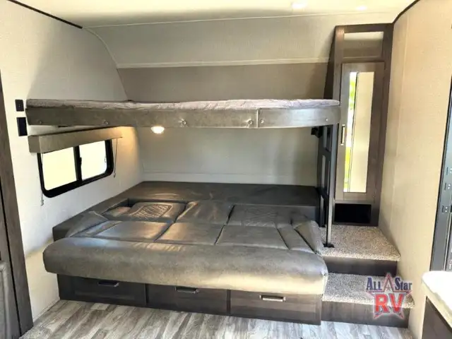 Walk-Thru Bath 12V DOUBLE DOOR FRIDGE; 20 LB PROPANE TANKS; 3 BURNER STOVE; BEDROOM SLIDE; DOUBLE BUNK BEDS; DUCTED A/C; JACK-KNIFE SOFA; MICROWAVE OVEN; OUTSIDE SPEAKERS; PASS THROUGH STORAGE; POWER AWNING; PREP FOR REAR VIEW CAMERA; QUEEN WALK-AROUND BED; ROOF LADDER; SPARE TIRE; STABILIZING JACKS; STEREO SYSTEM W/BLUETOOTH; THEATRE SEATING; TV