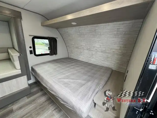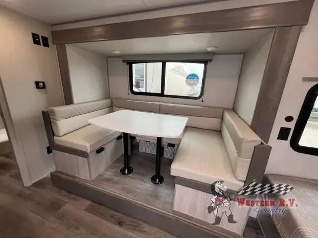 This spacious travel trailer can sleep eight campers each night thanks to the double-size bunks in the back, the U-shaped dinette within the slide out, and the queen bed up front! You can easily make meals for your crew with the two burner cooktop and microwave oven, and leftovers can go in the 10.7 cu. ft. 12V refrigerator! After you've cleaned up in the full bath, head outdoors to relax under the 15' power awning with multicolor LED lights and a remote!