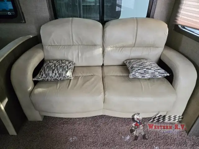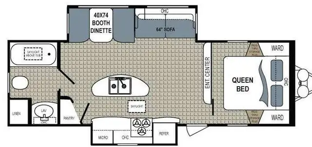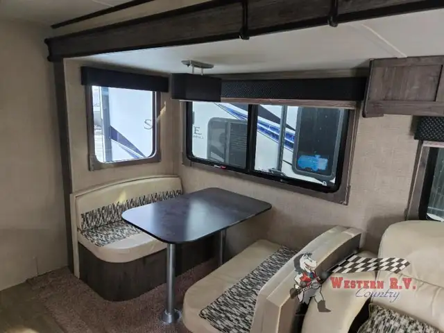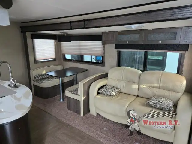 Across the room you will find a booth dinette and 64in.in. sofa. The sofa has overhead storage for your things. There is an entertainment center nearby that can easily be viewed for your enjoyment.