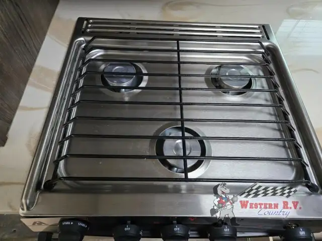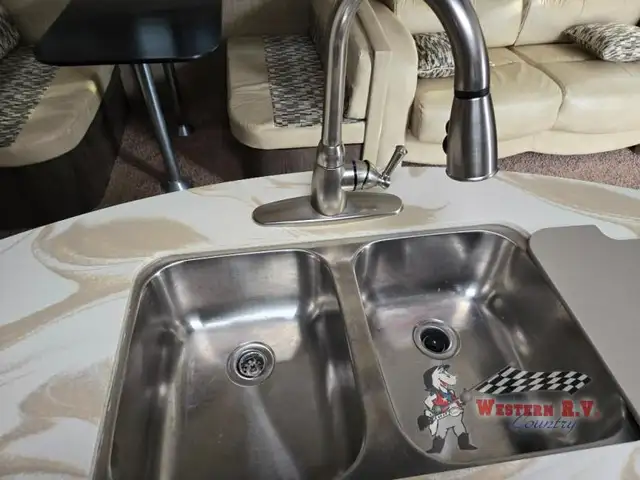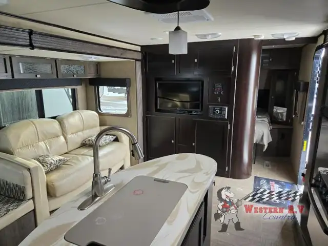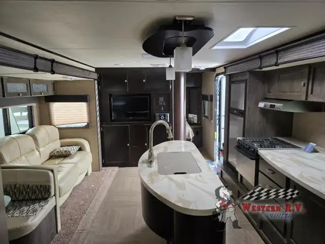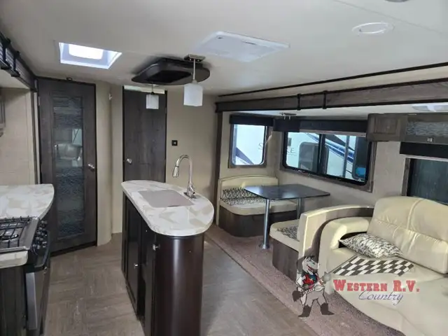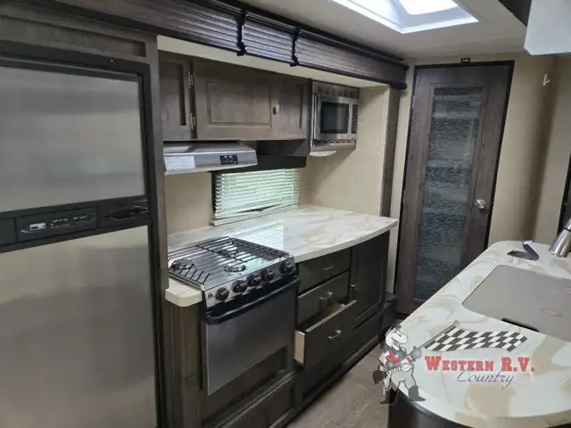 As you enter you will be amazed at the space inside with dual opposing slides fully extended. The kitchen features everything you need to prepare and cook great food while on the go. There is a refrigerator, three burner range, and counter area with overhead microwave slide-out. Near the slide find a large pantry for dry and canned goods storage and more. The convenient island features a bit more counter space and a double sink for cleanup. There is even a skylight to bring the natural light indoors.
