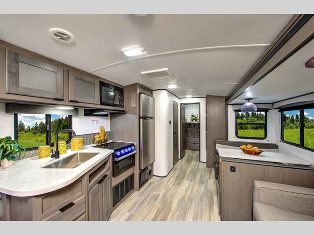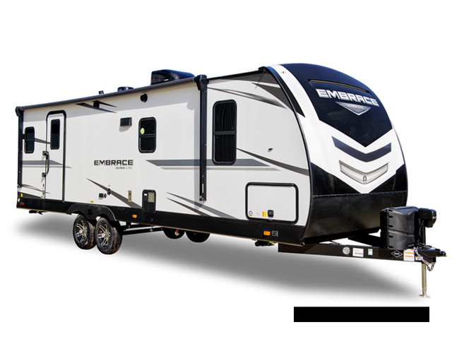 Each Embrace travel trailer by Cruiser is constructed with laminated rear wall and slide out ends, a 6' 11in.in. aluminum roof, and 5/8in.in. tongue and groove plywood flooring for durability. The industry leading E-Z lube axles will provide smooth towing from home to campground, and the heated and enclosed underbelly will allow you to camp well into the colder months. Inside, you'll love with the solid surface countertops, the charging station with 12V and USB ports, plus concealed cabinet door hinges for a more at-home feel. The Embrace also features the patent pending full belly storage system so you can bring along extra coolers, hiking gear, and tackle boxes with ease!