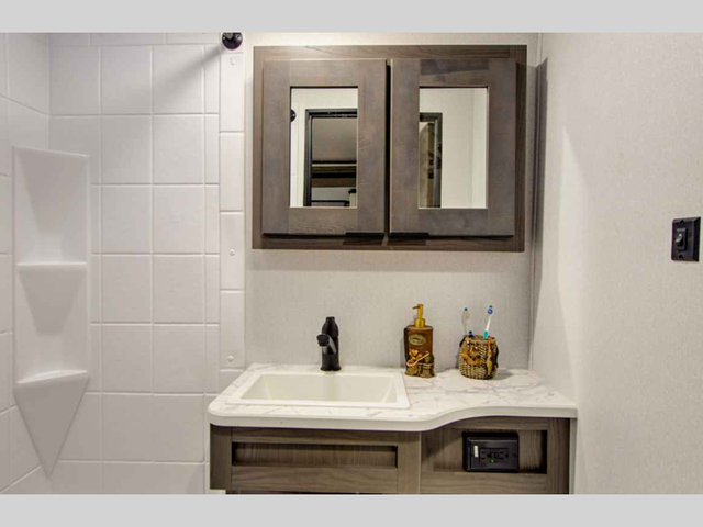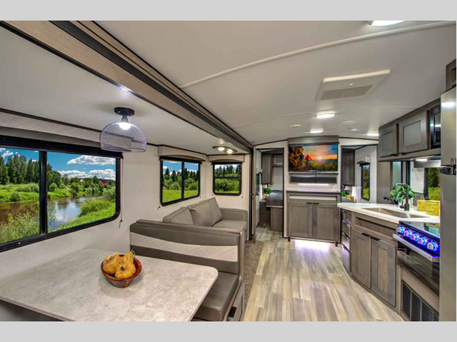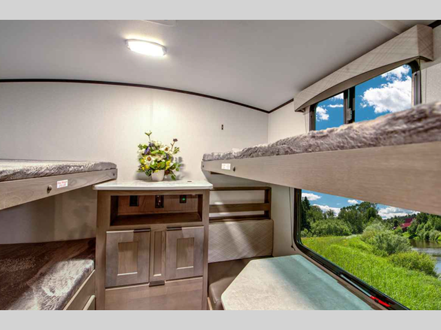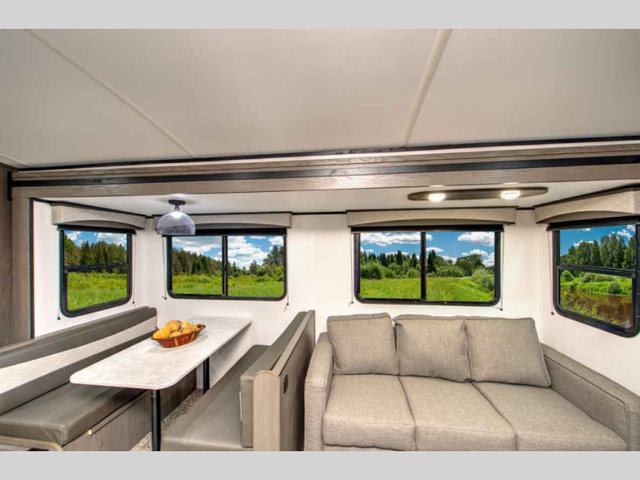 Make unforgettable camping trips in this travel trailer for nine! Your guests or the kids will love the private bunkhouse that includes three bunks, plus a booth dinette where they can enjoy a snack or work on their laptop. The full bath is close by for convenience, and the large slide out in the main living area will allow everyone space to move about freely. This model includes a 39in.in. LED TV within the entertainment center, plus a tri-fold sofa and a booth dinette for comfortable seating space. You will love the king bed sliding system in the front bedroom that allows you move the bed from left to right so you can easily access the dual bedroom wardrobes. You can't pass this travel trailer up!
