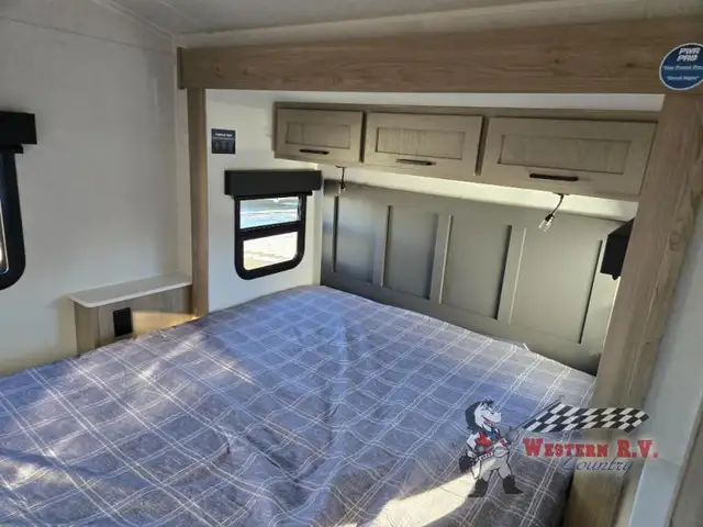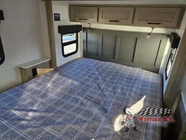 Unwind and relax in style, with plenty of storage space to keep you organized. The rear bedroom is a peaceful retreat, featuring a queen bed, spacious wardrobe, desk, and TV. The walkthrough bathroom is a practical and refreshing space, with a linen closet to keep your towels and toiletries tidy. Plus, the kitchen is equipped with a fridge, convection microwave, dinette, sink, and overhead cabinets, so you can prepare delicious meals and snacks with ease and enjoy quality time with loved ones.