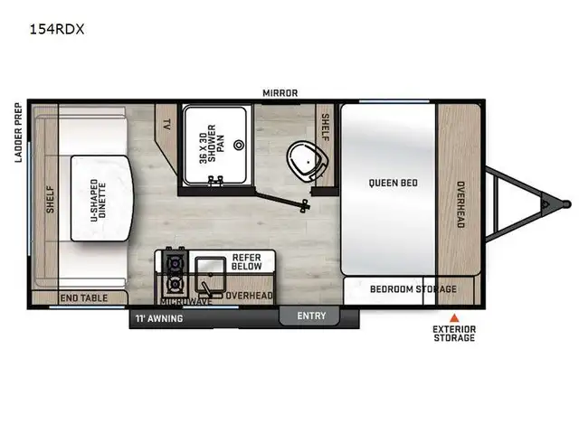 The perfect unit for a cozy weekend retreat for two or three! There is a queen bed up front with overhead storage and more at the foot of the bed to keep your things tidy. The rear of the unit offers a U-shaped dinette with an end table on one end and a handy overhead shelf which is a great spot for meals, watching TV or playing cards and games. A mid-coach bath includes a 36in.in. x 30in.in. shower and toilet with foot flush, plus a storage shelf for necessities. This model also includes a GE two burner cooktop, a GE stainless microwave oven, plus a 3.3 cu. ft. 12V refrigerator to keep food fresh!