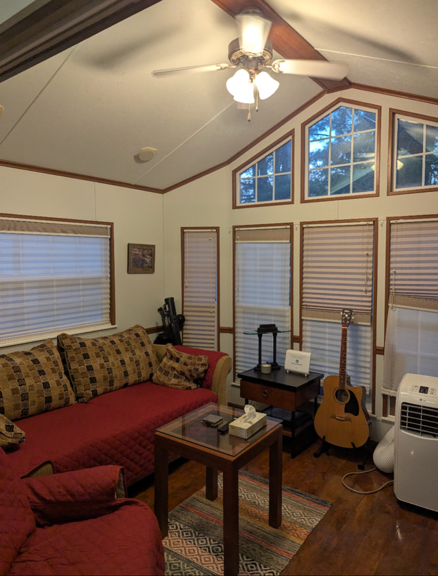 - Living room with pull out queen size bed and reclining chair(both with covers and pillows), privacy divided sliding door,electric fire place, hi-fi Denon amplifier with Klipch tower speakers and two in ceiling satellite speakers,50" Sansui smart TV, professional telescope