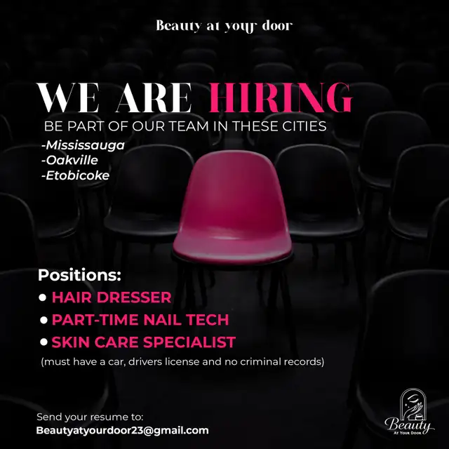 We are looking for enthusiastic professionals for our Mississauga location. Specifically hiring experienced hair dressers, an esthetician and a nail tech.