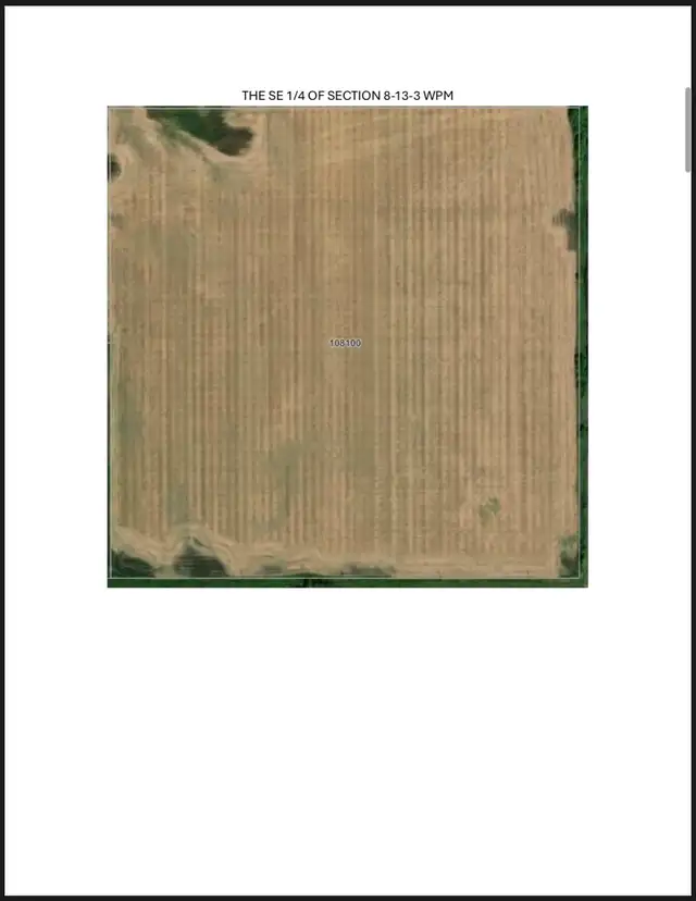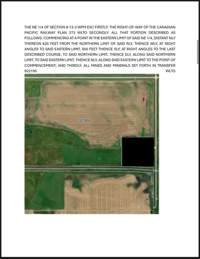 THE NE 1/4 OF SECTION 8-13-3 WPM EXC FIRSTLY: THE RIGHT-OF-WAY OF THE CANADIAN PACIFIC RAILWAY PLAN 373 WLTO SECONDLY: ALL THAT PORTION DESCRIBED AS FOLLOWS: COMMENCING AT A POINT IN THE EASTERN LIMIT OF SAID NE 1/4, DISTANT NLY THEREON 625 FEET FROM THE NORTHERN LIMIT OF SAID RLY, THENCE WLY, AT RIGHT ANGLES TO SAID EASTERN LIMIT, 650 FEET THENCE SLY, AT RIGHT ANGLES TO THE LAST DESCRIBED COURSE, TO SAID NORTHERN LIMIT, THENCE ELY, ALONG SAID NORTHERN LIMIT, TO SAID EASTERN LIMIT, THENCE NLY, ALONG SAID EASTERN LIMIT TO THE POINT OF COMMENCEMENT; AND THIRDLY: ALL MINES AND MINERALS SET FORTH IN TRANSFER 922195 WLTO