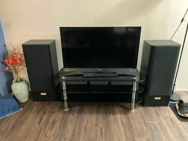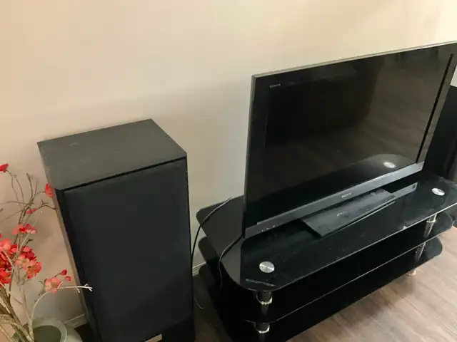 Moving and can't take it with me. Sony 40 inch LCD TV with glass tv stand and 2 tower speakers. Everything works. $120 for the set. Located in Fort Richmond