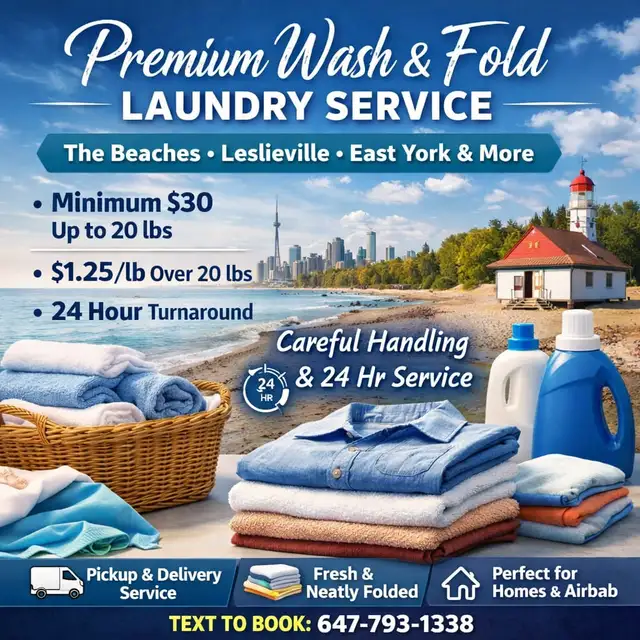 Professional Wash & Fold Laundry Service available in The Beaches, Leslieville, East York, Upper Beaches, and nearby areas.
