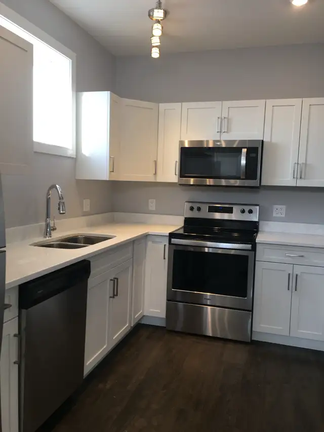 Modern cabinets in kitchen with 5 stainless steel kitchen appliances- fridge, stove ,dishwasher , microwave with OTR fan. Quartz countertops.
