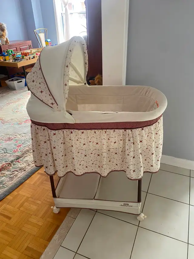 This is a Starlight Napper bassinet with a canopy. It has a cozy mattress and a patterned skirt. It's on wheels for easy movement, and you can also rock the baby. Excellent condition, asking $15.00 for a quick sale. Please call 416)795-2777