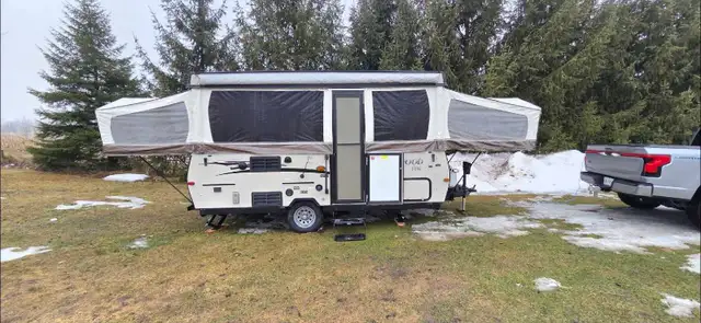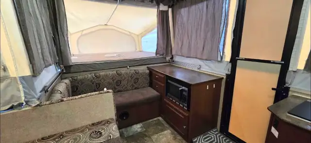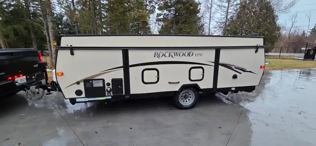 This Forest River Rockwood High Wall HW276 pop-up camper is perfect for your medium sized family or group of friends. This unit features plenty of seating areas between the gaucho sofa with seat and 72"x 50" booth dinette. You can cook the perfect burger on the outdoor gas grill while you jam out to music with the AM/FM media center with Bluetooth. A 13' awning with a LED light strip illuminates the night as you create wonderful memories together.