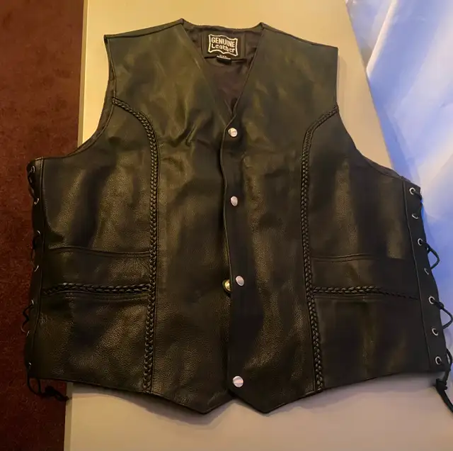 I have a black leather motorcycle vest for sale for $30.00 It is size 3XL and is in brand new condition. If you are interested call Sharon at 519-747-0709.