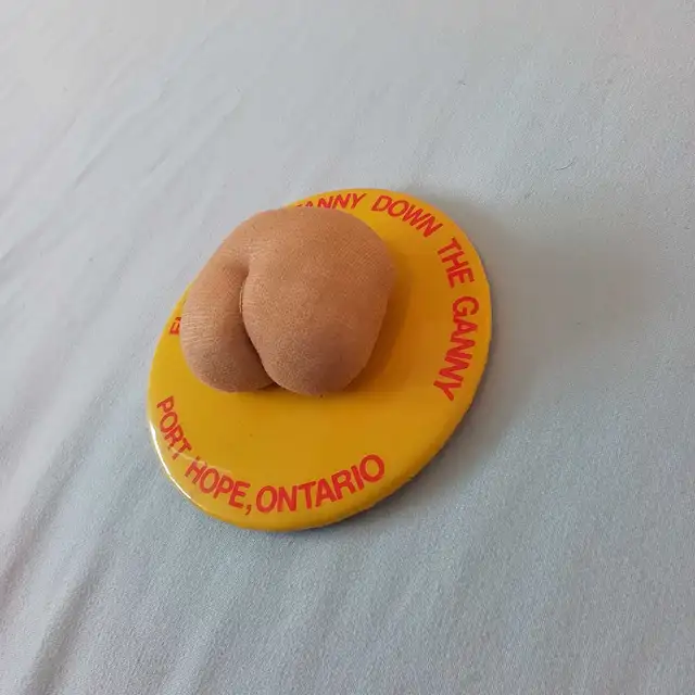 Vintage pin. FLOAT YOUR FANNY DOWN THE GRANNY. Front of pin is in excellent pre-owned condition. Back of pin shows age. Pin is 3 inches wide. The FANNY is approximately 1.0 in height.